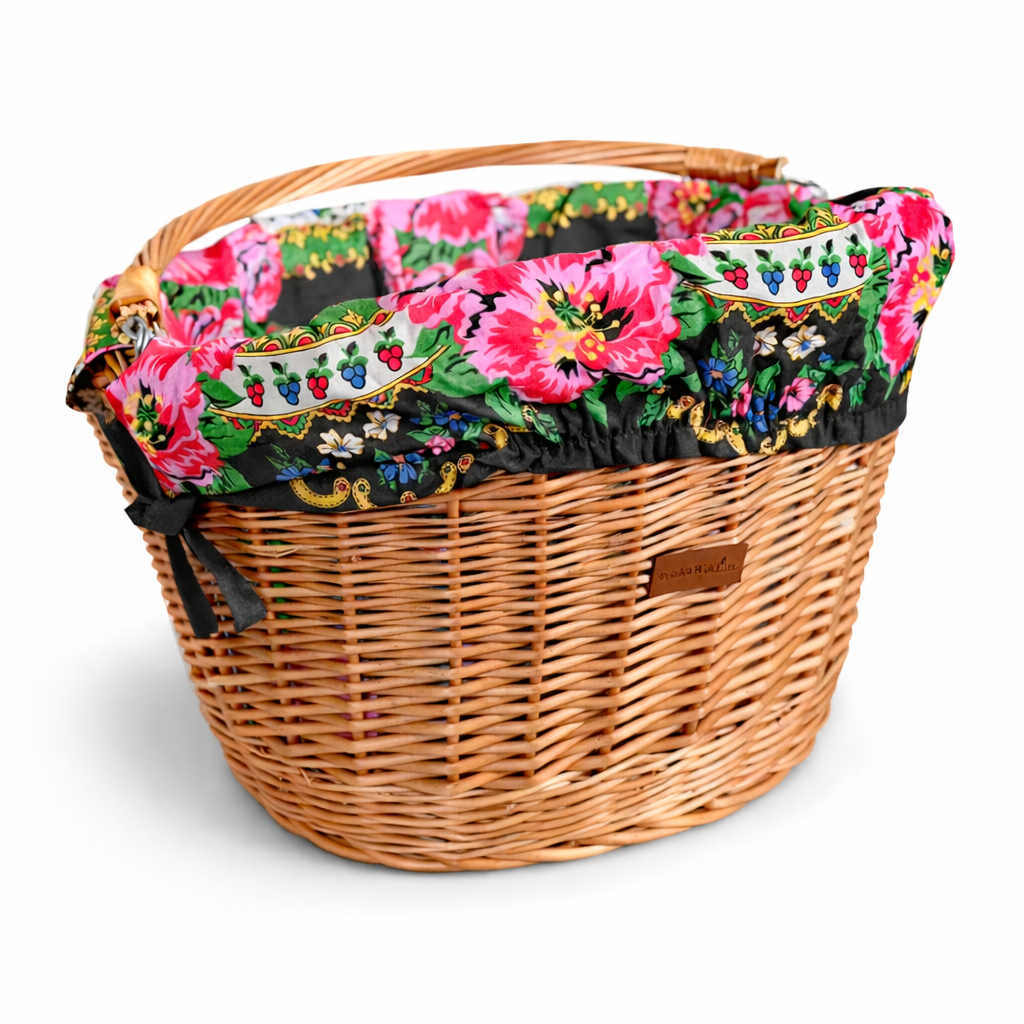 Wnętrze kosza wykończone jest materiałowym wkładem w folkowym wzorze, który nadaje całości wyjątkowego charakteru. Kolorowy, roślinny motyw inspirowany tradycyjnymi wzorami doskonale komponuje się z naturalną wikliną, tworząc spójną i estetyczną całość. Wkład nie tylko pełni funkcję dekoracyjną, ale również chroni przewożone przedmioty i zwiększa komfort użytkowania.