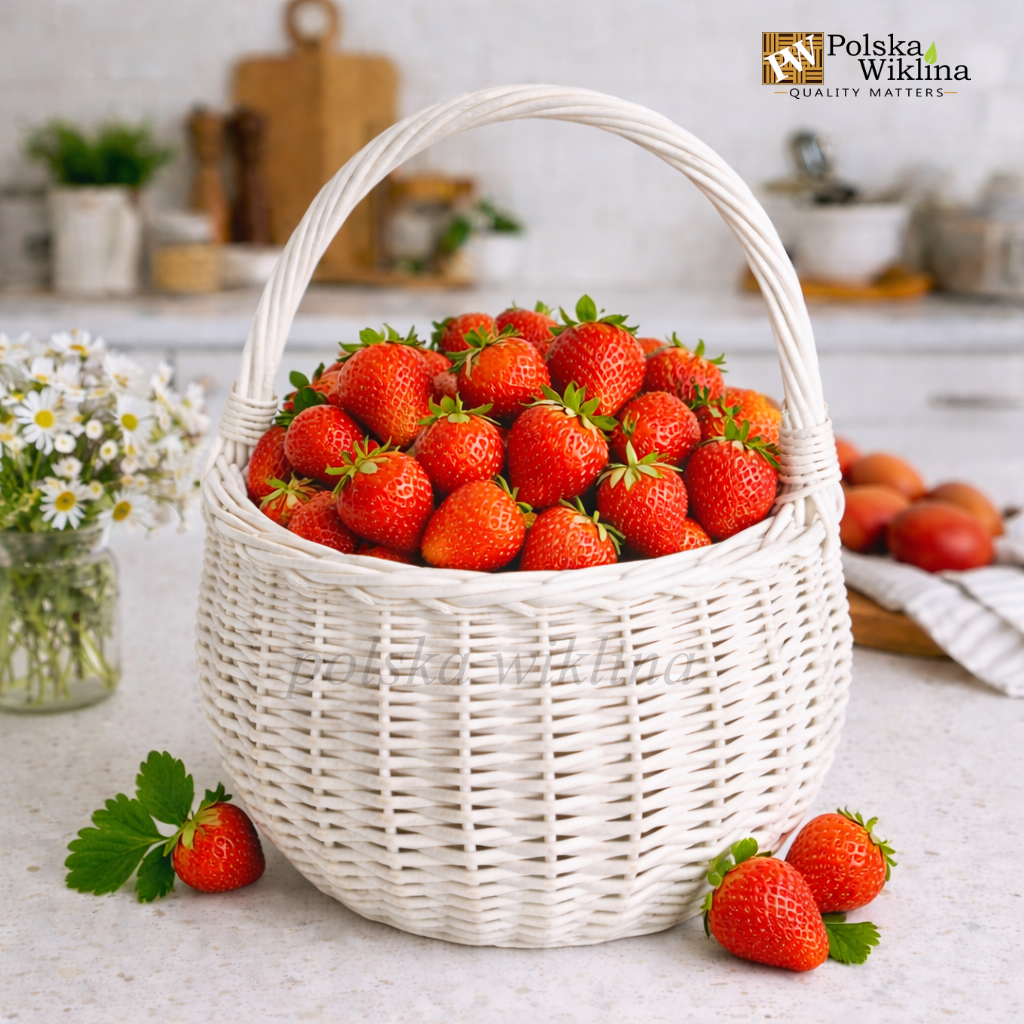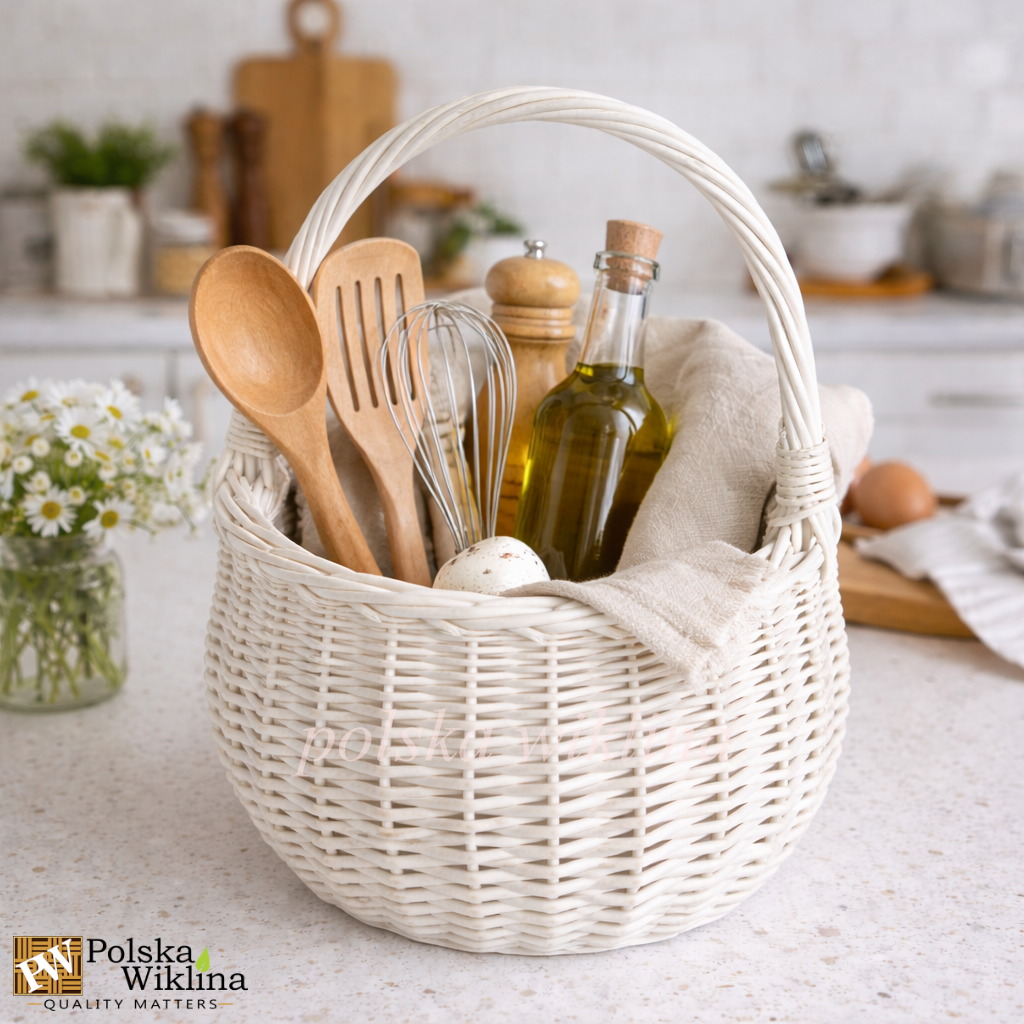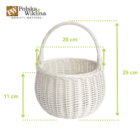 | Wykonanie | Kosz świąteczny wiklinowy został wykonany w całości ręcznie w Polsce z wikliny pochodzącej z polskich upraw. Do produkcji kosza świątecznego wykorzystano wiklinę o średniej grubości. Koszyczek jest wykończony tradycyjnym splotem tzw. wałkowym. Jest bardzo lekki i posiada uniwersalny rozmiar. Kosz może występować z dłuższą bądź krótką rączką. Kolor uzyskany w procesie wybielenia wikliny. |