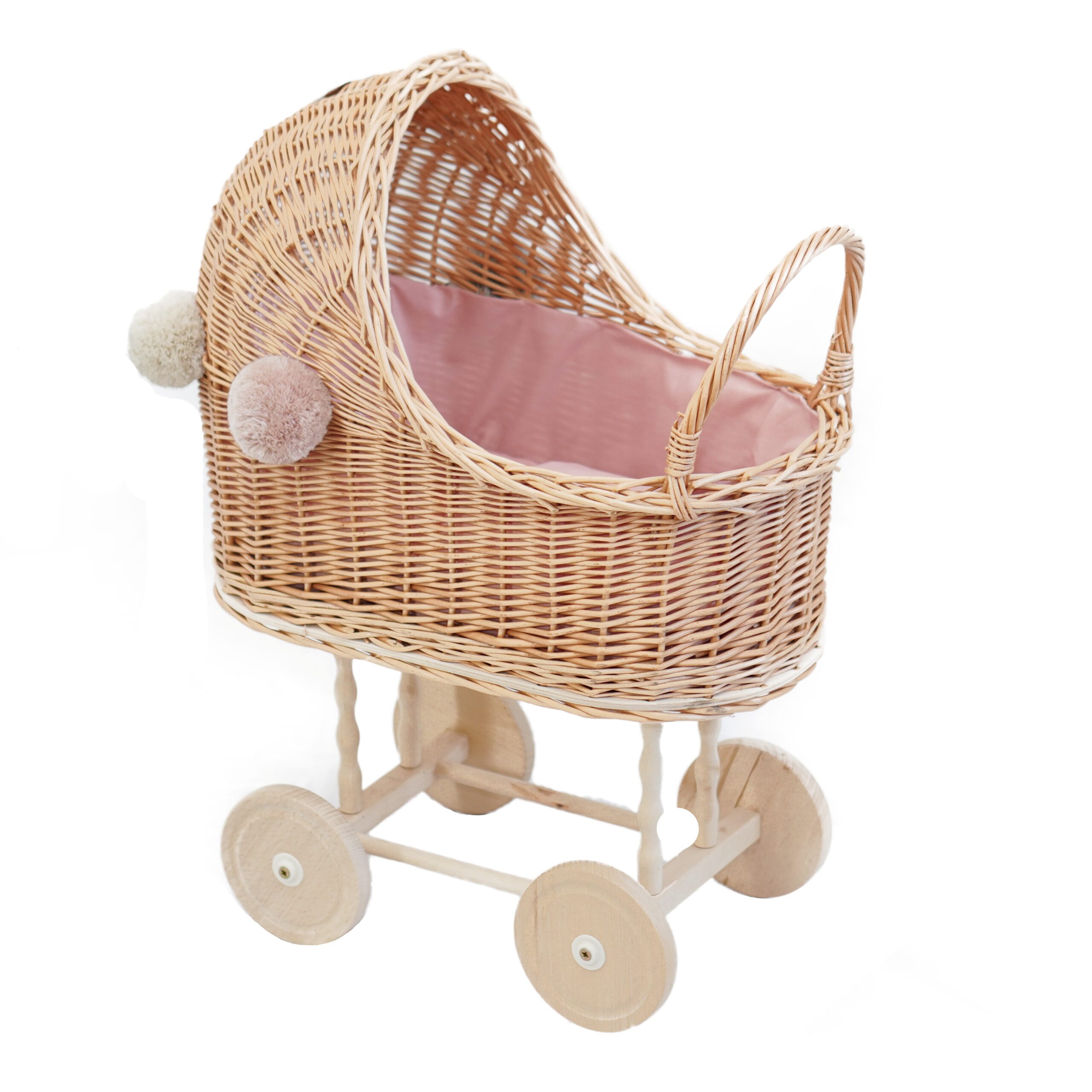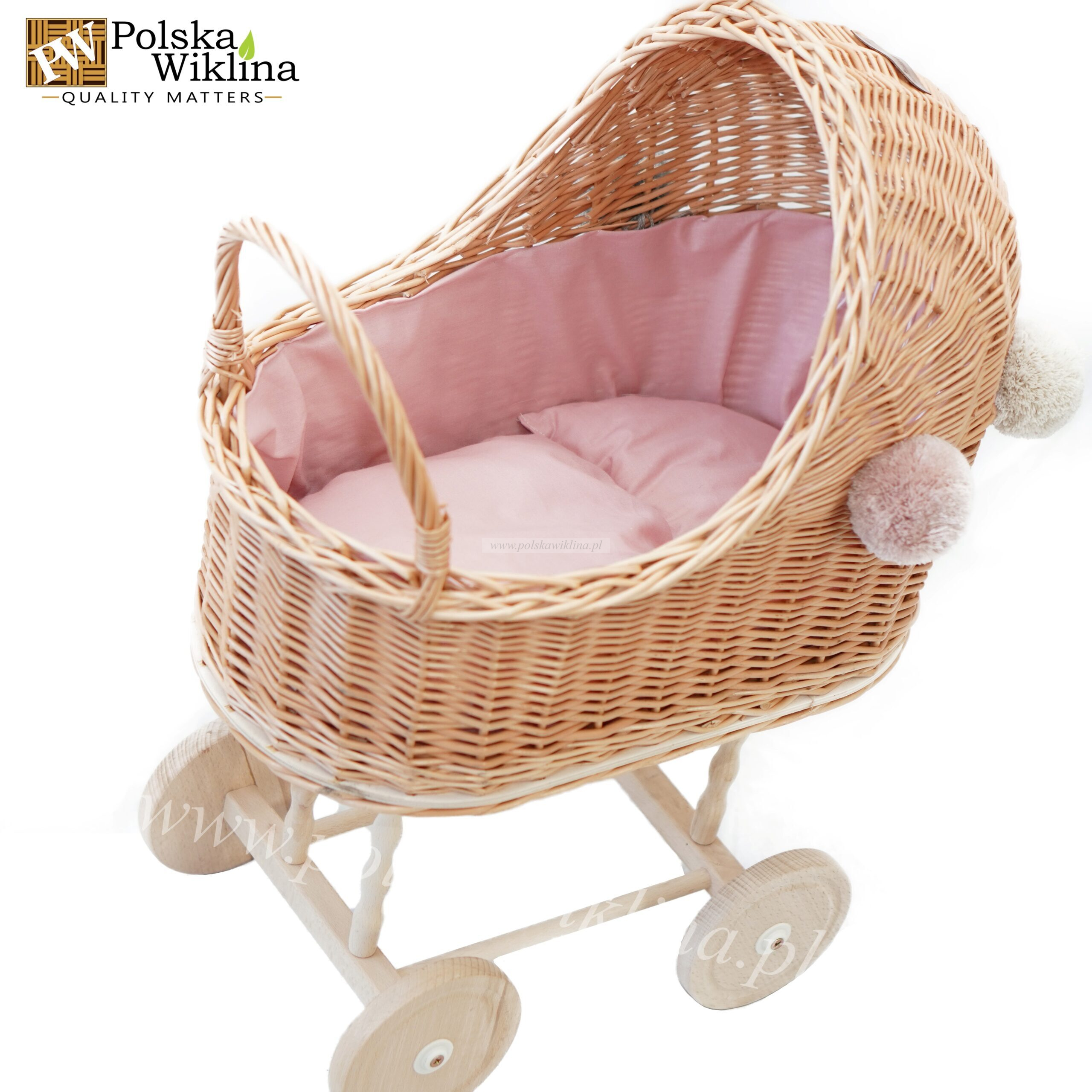 | Obszycie | Wózek obszyty jest bawełnianym materiałem w kolorze brudny róż, które pasuje do każdego kolory pomponu. Dodatkowo w zestawie znajdują się kołdra i poduszka. |