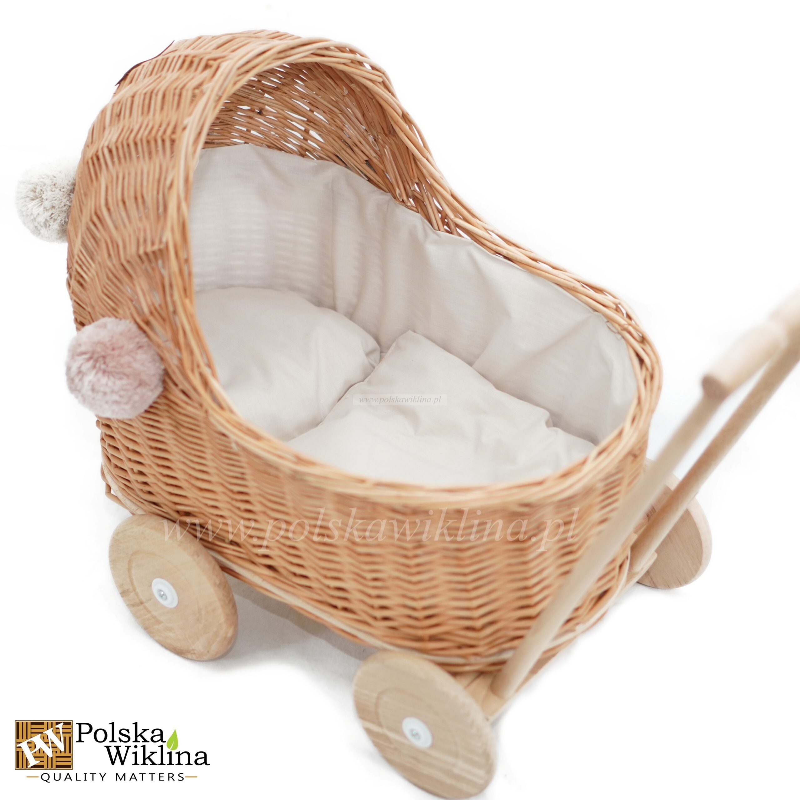 | Obszycie | Wózek obszyty jest bawełnianym materiałem w kolorze beżowym, które pasuje do każdego kolory pomponu. Dodatkowo w zestawie znajdują się kołdra i poduszka. |